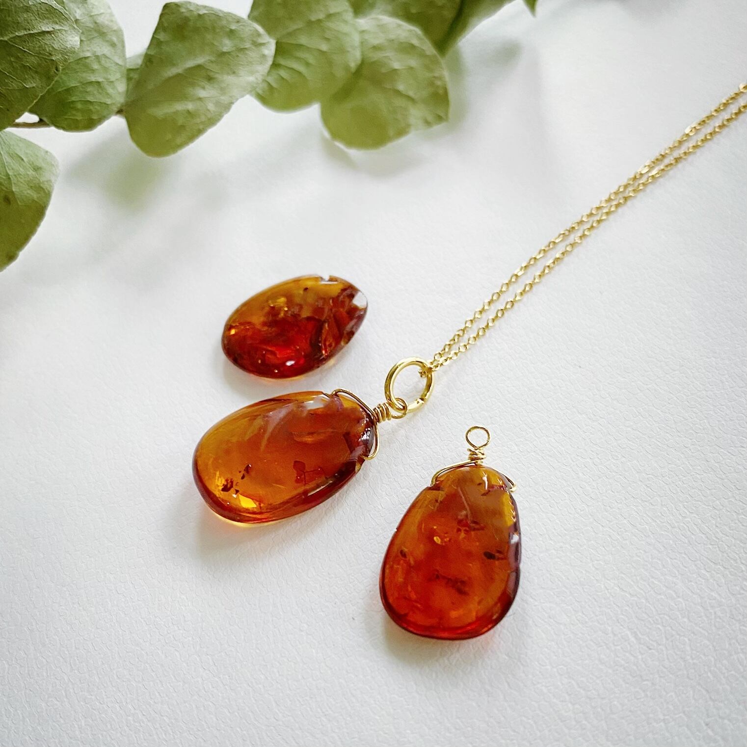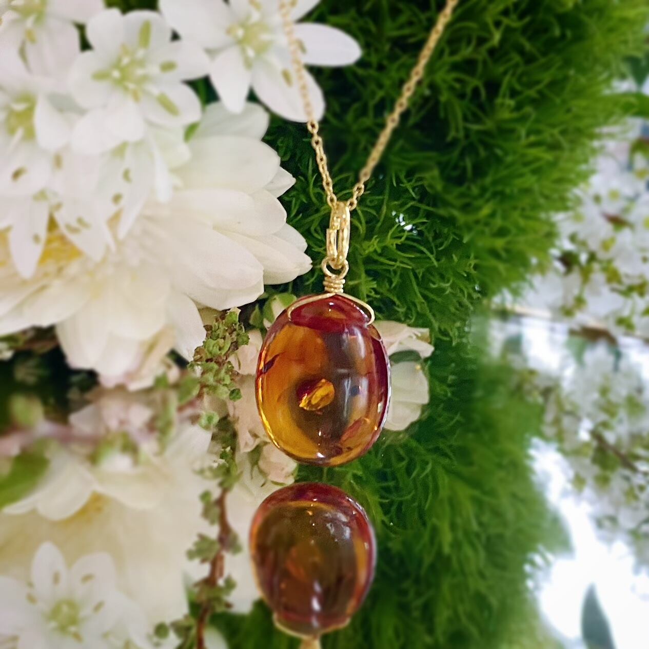小粒でしか中々手に入らない琥珀ですが、こちらは大粒を厳選してセミロング丈のネックレスにしました。