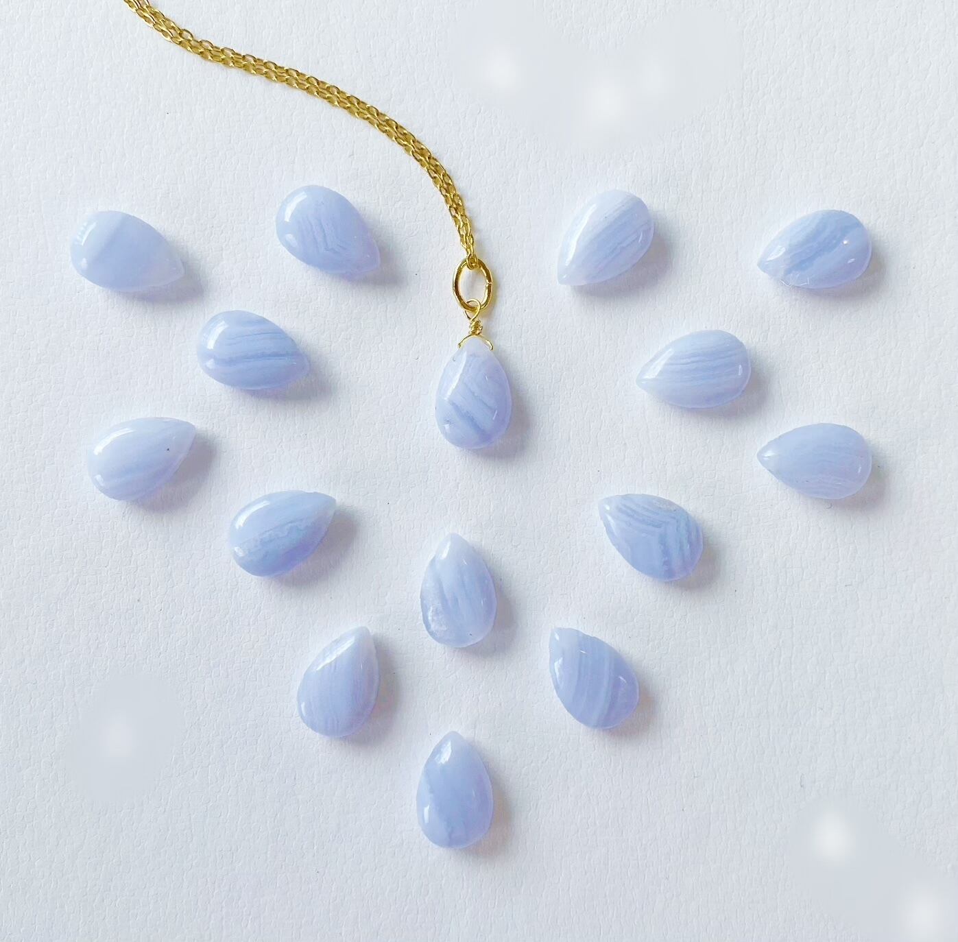 「空色縞瑪瑙」と呼ばれ、その名の通り水色の瑪瑙に縞模様が入ったものをブルーレース(またはブルーレースアゲート)と呼びます。淡い水色や白色が層状に重なって、まるでレースのように見えることからこの名が付けられました。古来より危険を回避するお守りとして、人々の身近にある存在でした。チベットでは、この石の美しい模様を蓮の花に例えて、「神の石」として崇めていたそうです。