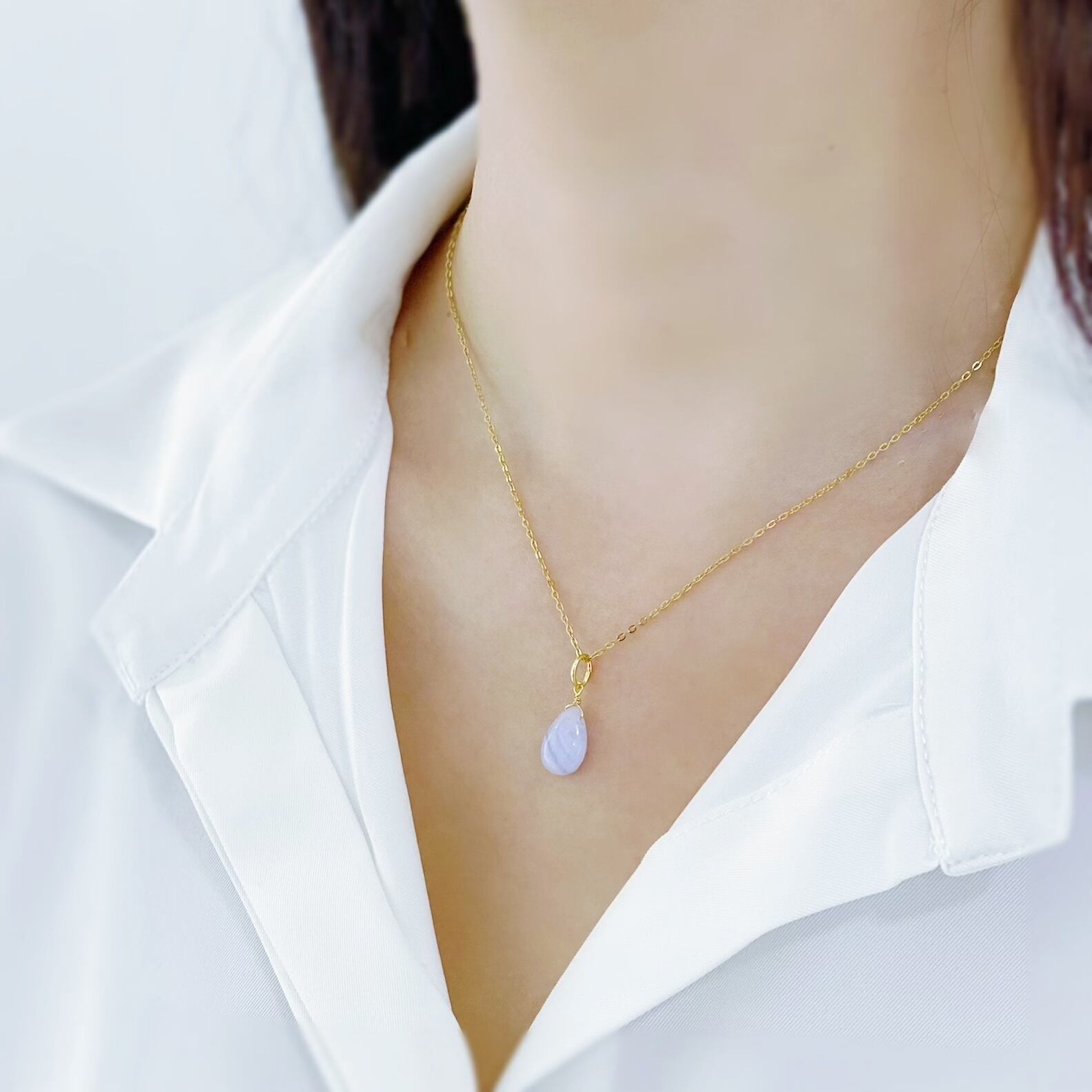 女性らしさを体現したような、うっとりとした優しげな表情。癒しの石、ブルーレースのネックレスです。