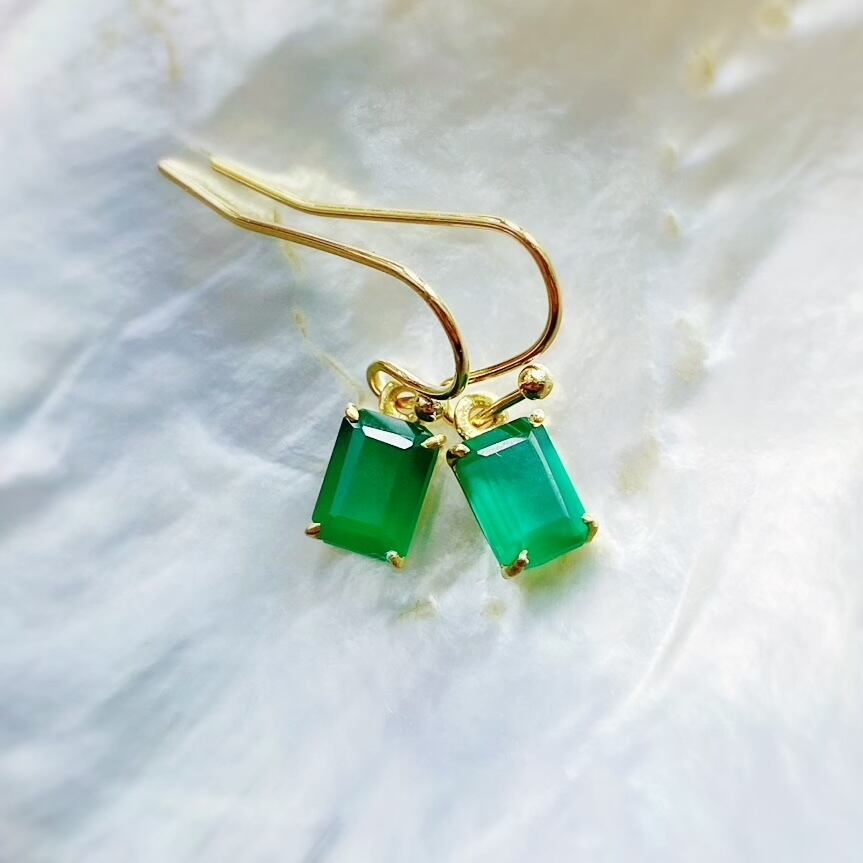 高発色グリーンオニキスのスクエア枠留ピアス -Fée de la forêt-