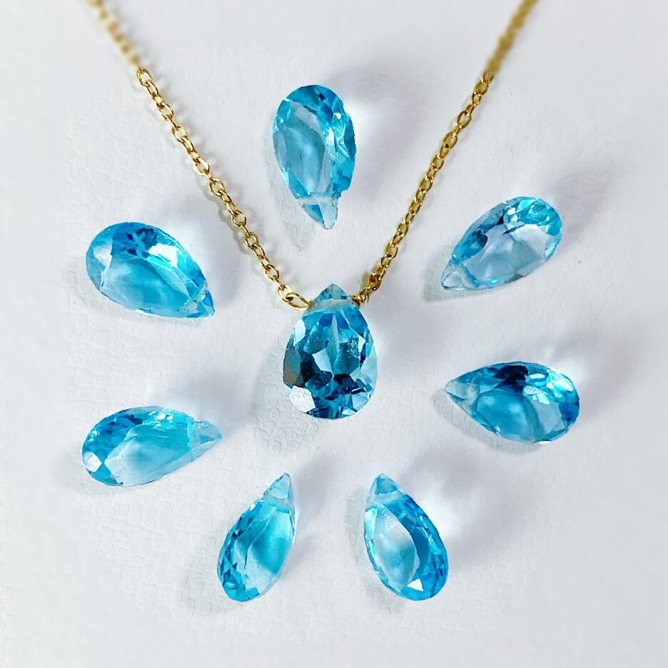 スイスブルートパーズは、通常のブルーより濃く鮮やかなトパーズと定義されており、スカイブルーよりも濃く、ロンドンブルーよりも明るいトーンをもっています。明るくビビッドなブルーが魅力的で人気の高い宝石です。